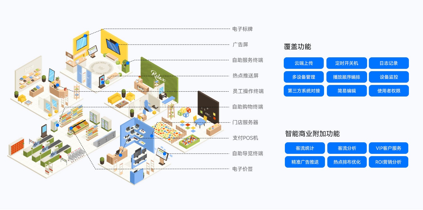 球盟会·QMH智慧零售解决方案搭配球盟会·QMHGDSM-ES智能零售管理系统,为全球零售门店客户提供了功能齐全的数字化运营管理工具,提供广告显示信息编辑、信息发布、AI识别、客户分析和会员管理等功能,实现对设备、内容、营销、运营的综合数智化管理能力,为精准运营管理赋能。