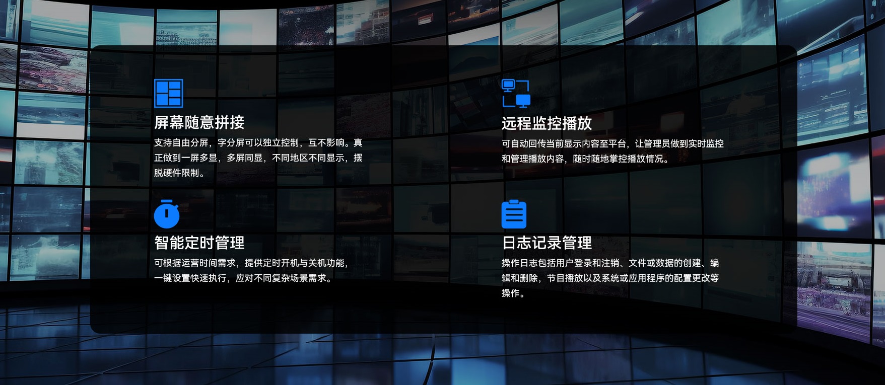 球盟会·QMHGDSM-ES智能零售管理系统可 实现多屏拼接/多屏分离自由选择,也可画中画显示,用户可根据场景自行灵活安排,更可以异形屏幕显示安排,让广告显示更加丰富多彩。同时,还可以轻松查看设备的基本信息,如连接状态、播放状态、播放到期时间,屏幕类型等;可对设备进行分组远程管理,远程设置定时开关机时间,控制设备音量,远程重启、远程升级,远程截屏查看实时画面等,实现屏幕智能管理。