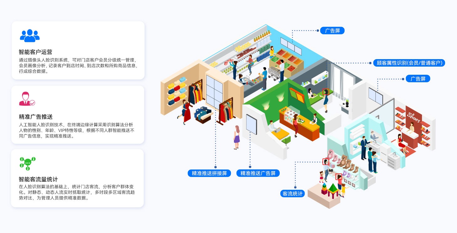 球盟会·QMHGDSM-ES智能零售管理系统还可实现宣传推广内容的精准推送,高效触达。系统融合人工智能技术,采用专业的人脸识别算法,通过终端接入摄像设备与AIOT设备,自动识别不同的物体、动作和行为,形成人物画像,为广告屏幕的内容推送提供数据支持,实现精准营销。同时还可以提供客流统计和客群分析功能,为零售客户提供精准的门店数字化运营管理方案。