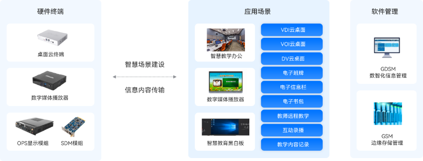 球盟会·QMH科技以桌面云终端、数字媒体播放器、SDM模组和工业主板为硬件支撑,数字化信息管理和边缘存储管理等软件技术为辅,构建智慧教育数字化底座,帮助客户完成智慧教育升级改造,满足各场景下的用户需求。