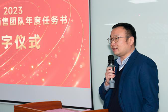 签约仪式中,国际营销中心业务代表刘正文和国内营销中心业务代表李喆发言,两位代表朴实的发言表示,销售人员必须要努力和坚持,要有愚公移山的精神才能成就了2022年的可喜成绩,同时完成2023年度目标必须怀着奋斗者的精神去努力拼搏,2023年我们业务会冲到前线,紧贴市场,紧贴客户,抢夺订单。